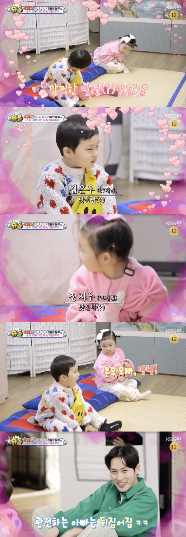 이어 은우는 지우에게 먼저 다가가 "악수하자"라고 악수를 신청했다. 두 사람이 수줍게 맞잡은 손을 본 김준호는 "은우가 아마 여동생이 처음이었을 것. 은우가 악수하며 인사하는 걸 처음 본다"라며 아들의 낯선 면모에 신기해하는 모습을 보였다.