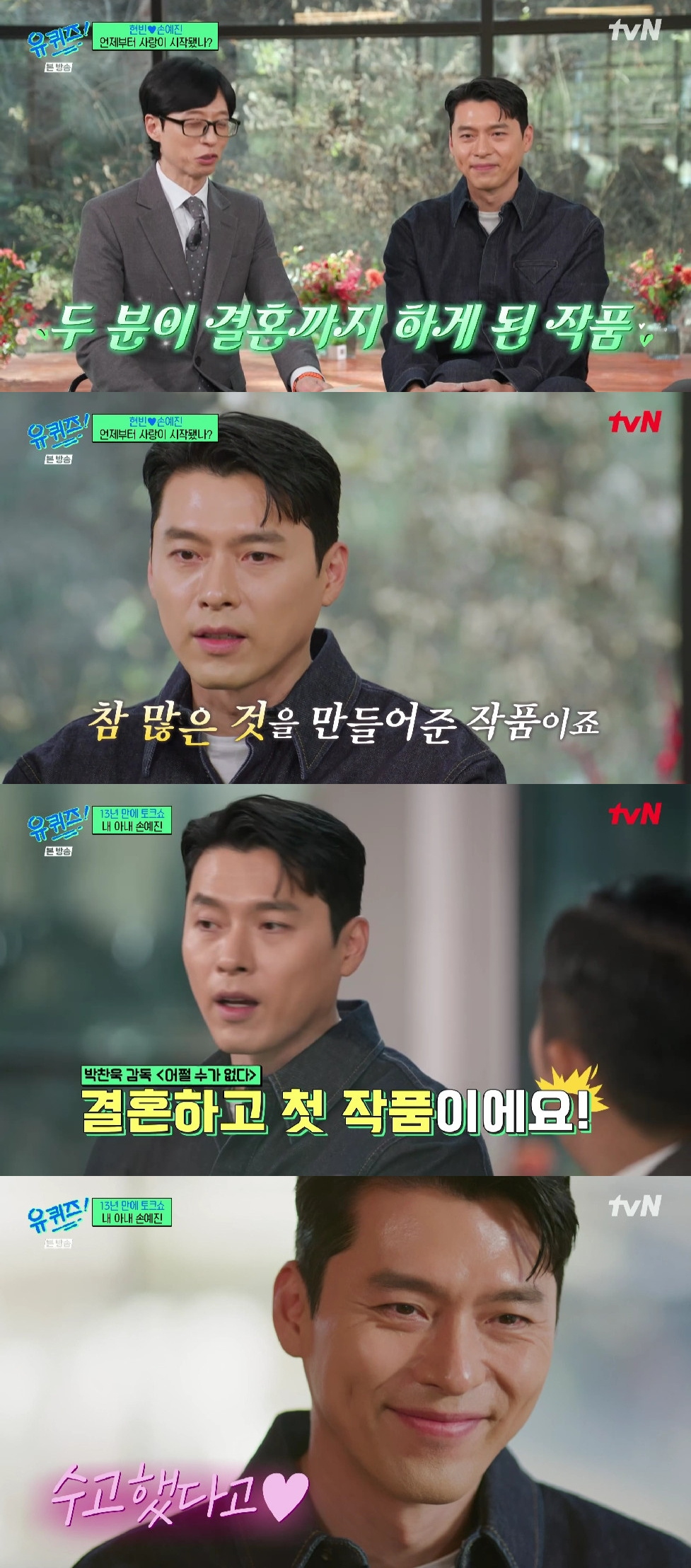 유재석은 손예진이 '유 퀴즈 온 더 블럭'에서 "지금 사랑이 첫사랑"이라고 말했던 것을 언급했고, 현빈은 "방송 보고 '아 그렇구나'라고 생각했다. 아내가 배우라서 좋은 점은 굳이 얘기를 다 안 해도 다 안다는 거다. 그리고 그게 단점이기도 하다. 너무 많이 알기 때문에 모든 스케줄이 파악된다"고 말했다.