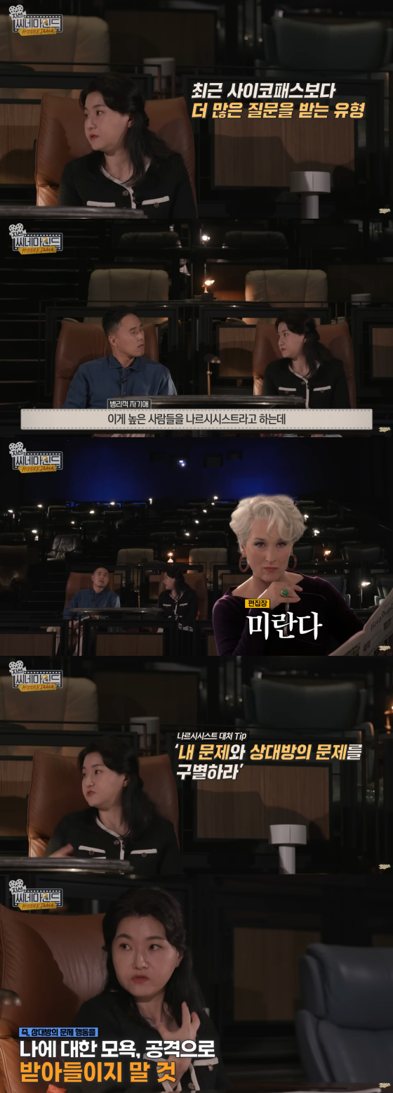 이어 "그런 직장 상사의 면모를 잘 보여주는 게 영화 '악마는 프라다를 입는다' 속 미란다(메릴 스트립 분)"라며 "나르시시스트의 핵심 중 하나가 '웅대한 자기상'이다. 자신에 대한 이미지가 너무 거대한 거다. 그래서 '나의 능력이나 존재는 정말 최고야'라고 생각한다. 의사 결정을 내릴 때도 남의 의견을 들을 필요가 없다고 생각해서 '내가 내리는 결정이 옳은 거야'라고 생각하는 것"이라고 설명했다.