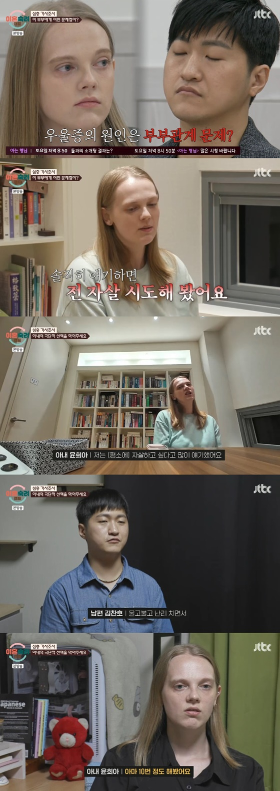 미국인 아내는 5년 전 우울증이 시작됐다고 밝혔다. 그는 "자살 (시도) 해봤다. (남편한테) 자살하고 싶다고 많이 말하고, 해보기도 했다"고 했다.
