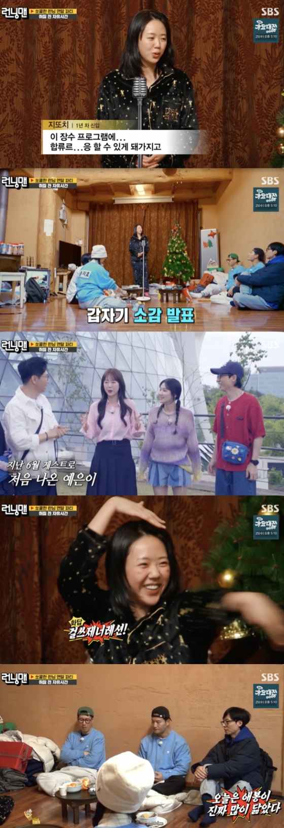이어 하하는 런닝맨으로 공식 합류하게 된 지예은에게 소감을 말해보라 요청했다. 이에 지예은은 잠옷 차림으로 "이 장수프로그램에 제가 합류할 수 있게 돼서 (기쁘다). 제가 연예인이 돼가지고 (누군가) '어디 프로그램에 나가고 싶냐'라고 물어보면 '런닝맨!'(이라고 말했었다"라고 털어놨다.
