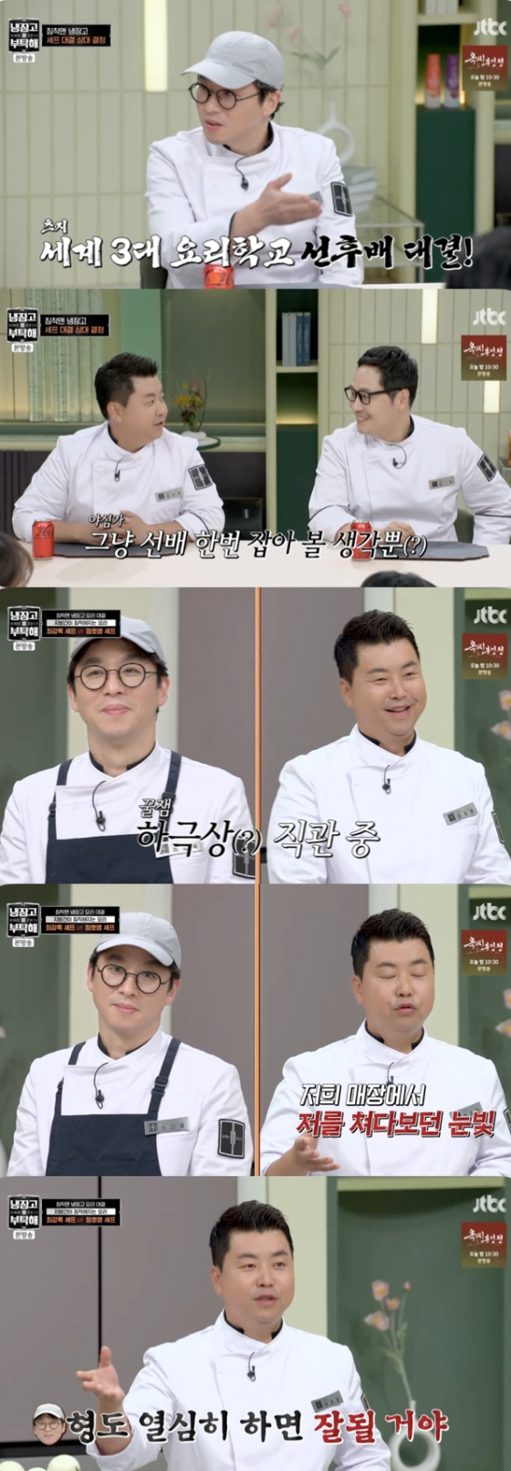 이에 정호영은 "저보다 (최강록이) 먼저 유명해졌다. '마스터 셰프 코리아2'에 에 출연해 제가 '냉부'에 나가기도 전에 우승했었다. 그리고선 저희 매장에서 저를 쳐다보던 눈빛이 있다. '형도 열심히하면 잘 될거야'(라는 눈빛이었다)"라고 폭로해 최강록을 당황케 했다.