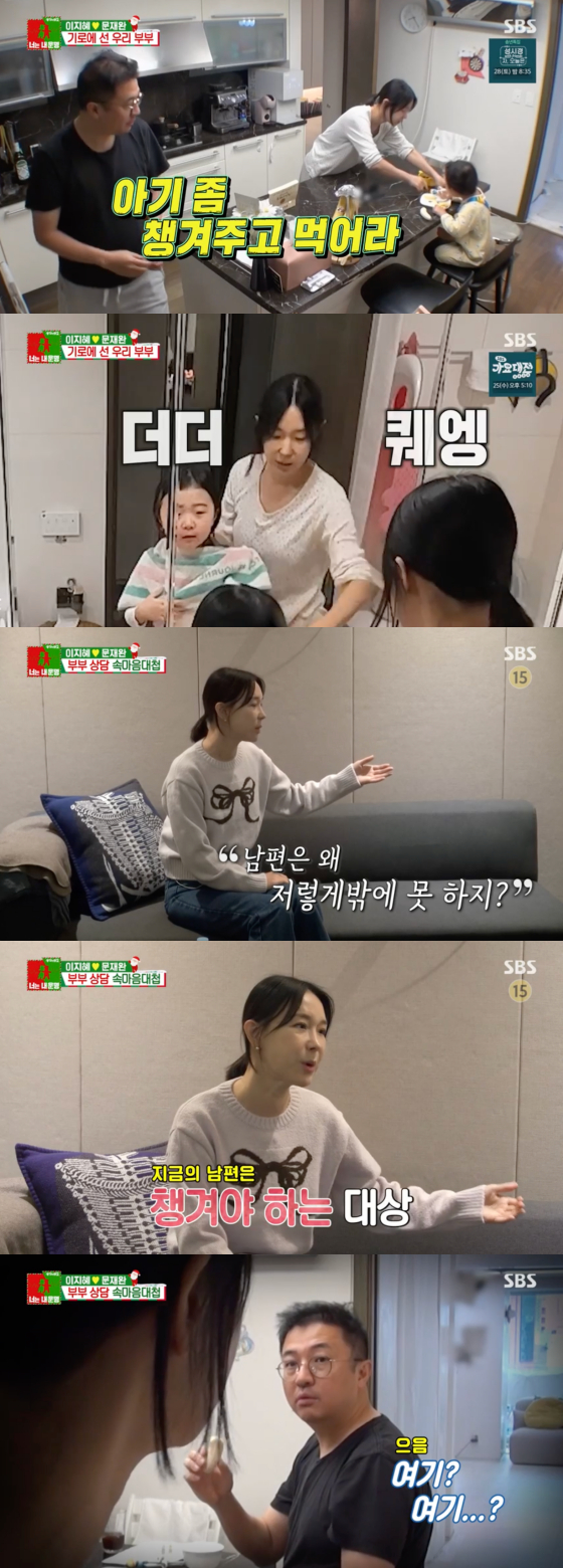 전문가를 만난 이지혜는 "남편이 나보다도 나아지기를 바라는 마음"이라며 "육아부터 집안 대소사까지 다 제가 한다. 남편이 하는 게 성에 안 찬다. 예를 들어 아이들 약을 먹일 경우, 남편은 아이들 약을 먹인 다음에 뒷정리를 하지 않고 쓰레기를 다 식탁 위에 둔다. 그러면 제가 또 치워야 하는 것"이라고 문재완에 대한 불만을 털어놨다.