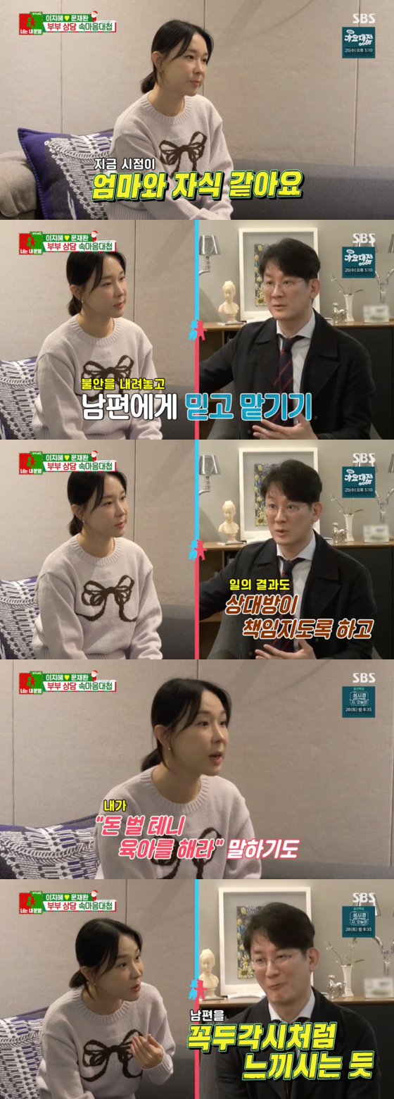 이에 전문가는 "엄마와 자식 같다"며 "남편에게 불신이 생기니까 자꾸 통제하려고 하는 거다. 하지만 남편을 존중해야 한다. 내버려 둬야 한다. 남편이 실수를 다소하더라도 믿고 맡겨야 한다. 일의 결과도 남편이 책임지게 해야 한다. 그걸 기다리고 바라 봐야 한다"고 조언했다.