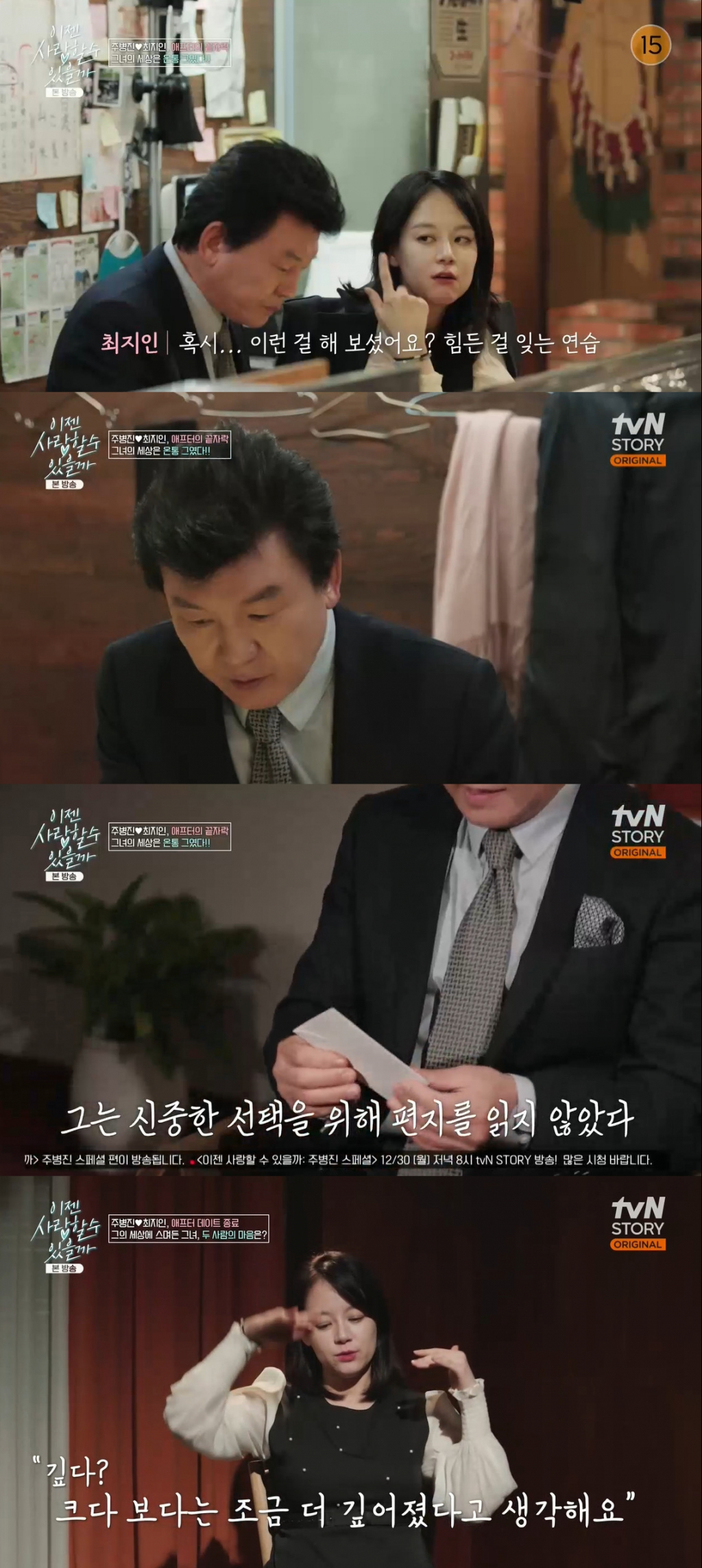 그러자 최지인은 "상처와 아픔을 잊는 게 필요한 거 같다. 난 좋으면 좋다, 싫으면 싫다고 말하는 걸 잘한다. 난 잊는 연습을 많이 했다. 너무 힘들었던 걸 마음에 담아두지 않고 잊어버린다. 어쩌면 기억이 안 나는 걸 수도 있다. 나도 다른 사람처럼 살아가니까, 힘든 것도 있고 상처도 있겠지만 말이다"라고 진지하게 답하면서 주병진에게 편지를 건넸다.