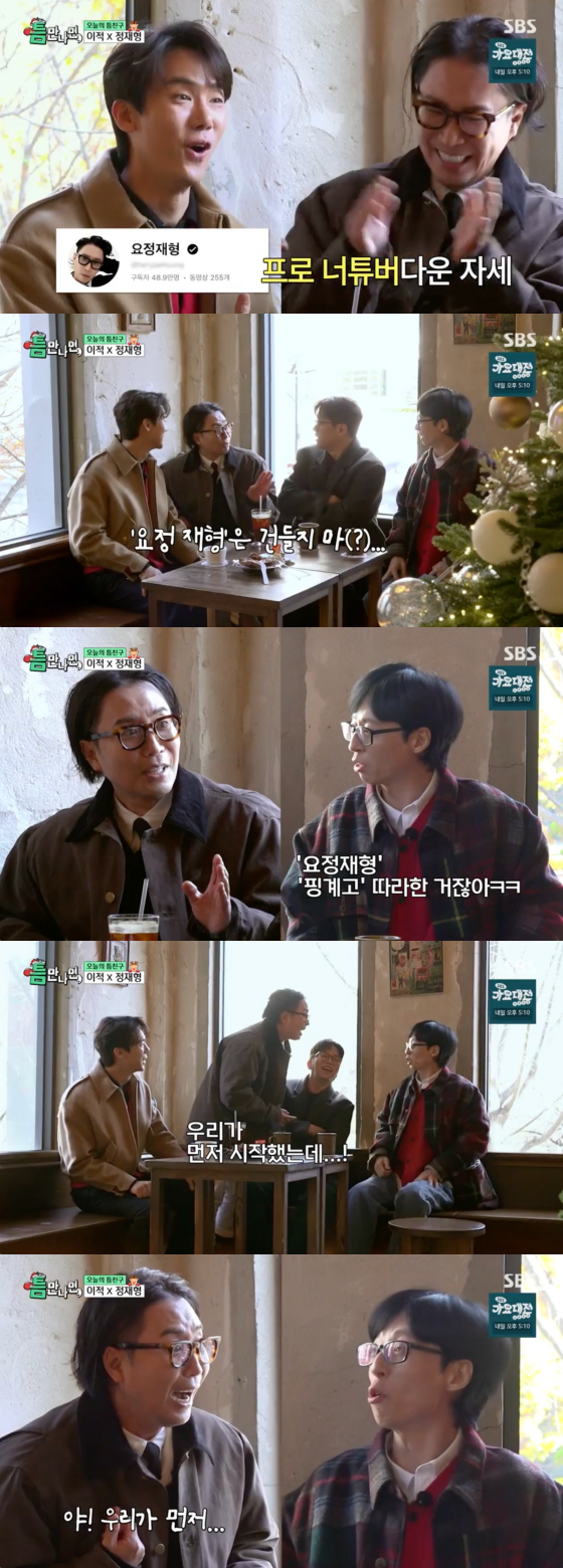 그러자 정재형은 자신이 운영 중인 유튜브 채널을 언급하며 "'요정재형'은 건들지 마라"고 제 발을 저렸고, 유재석은 "그거 '핑계고' 따라한 거 아니냐"고 받아쳤다.