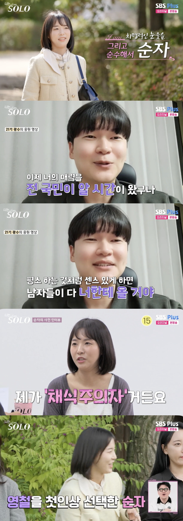 한편 남성들의 첫인상 투표에서 순자는 영식, 광수, 상철에게 3표를 받으며 '솔로 나라 24번지'의 인기녀로 거듭났다. 그런 순자의 첫인상 선택을 받은 남성 출연진은 다름 아닌 영철이였다.