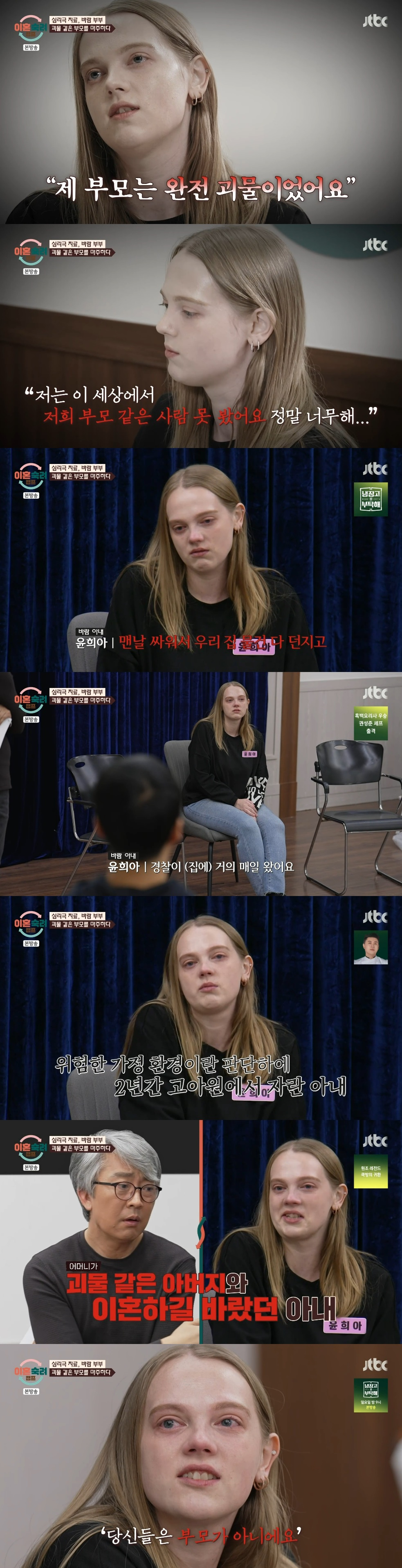 결국 입을 연 아내는 "내 부모는 완전 괴물이었다. 이 세상에서 우리 부모 같은 사람 못 봤다. 정말 너무하다"라며 "아빠는 마약을 만들어 팔았다. 맨날 싸워서 우리 집 물건 다 던지고 나한테 학대도 엄청 많이 했다. 경찰이 집에 거의 매일 왔다. 그래서 나는 아빠 때문에 2년 동안 고아원에서 자랐다. 아빠가 완전 미웠다. 그래서 엄마한테 '이혼해'라고 얘기했다. 근데 엄마는 '나중에 이해할테지만 아빠가 더 중요해. 아빠는 엄마가 필요해'라고 했다. 근데 나도 엄마가 필요했다. '그냥 새로운 부모님이 있으면 좋겠다. 당신들은 부모가 아니다'라는 말을 했었다"라고 밝혔다.