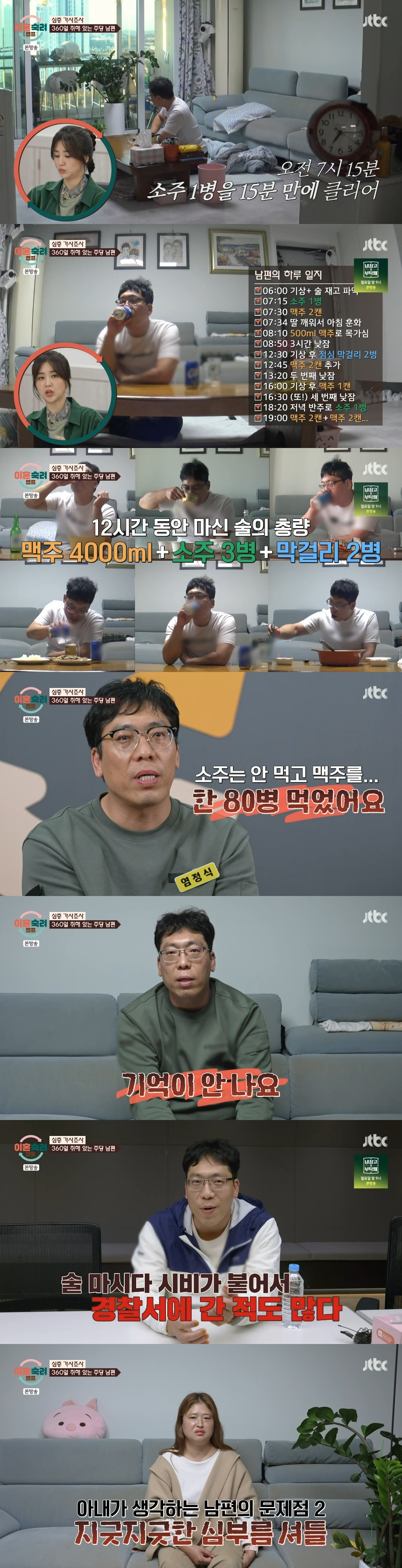 남편의 하루 일과를 살펴본 결과, 남편은 12시간 동안 맥주 4000ml와 소주 3병, 막걸리 2병을 마셨다. 그럼에도 남편은 "술을 더 적게 마신 것"이라면서 최근 주량에 대해 "이번주 목요일, 형님과 4차까지 간 것 같다. 두 명이서 소주는 안 먹고 맥주를 한 80병 마셨다. 다음 날 일도 못 나갔다. 연차로 처리했다"라고 밝혔다.