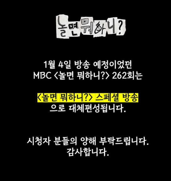 MBC '놀면 뭐하니'가 여객기 참사 추모 속에 4일 방송을 하지 않는다.