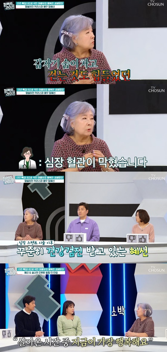 이날 정혜선은 2013년 심근경색으로 심장 스텐트 시술받았다. 당시 드라마 '지성이면 감천' 녹화 도중 증세를 느낀 그는 "어느 날 갑자기 숨이 차고 조금만 걸어도 힘들더라"라며 "녹화 다음 날 병원에 갔더니 심장 혈관이 막혔다고 했다"고 말했다.