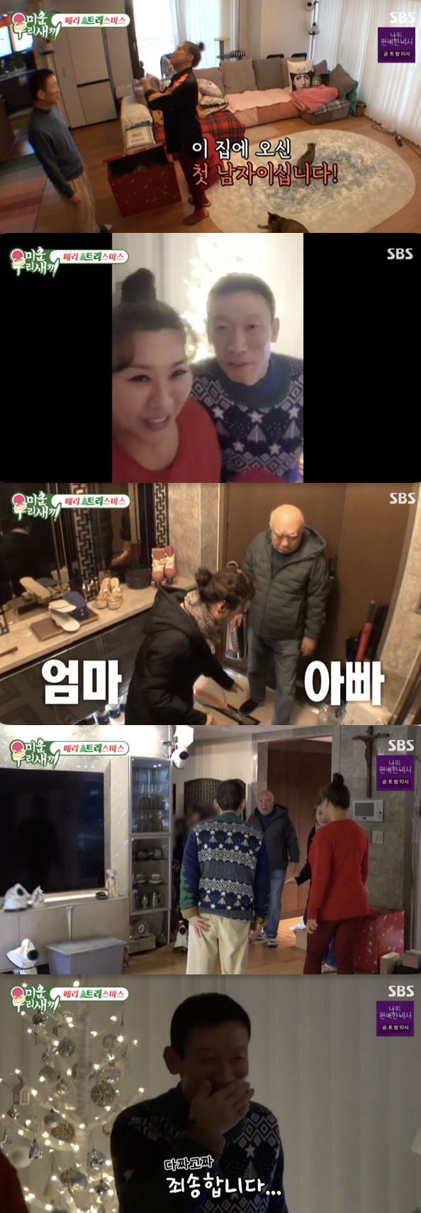 한편 두 사람이 크리스마스 커플 옷을 맞춰 입고 불을 끈 채 셀카를 찍는 동안 정영주의 부모님이 등장했다. 특히 정영주 부친의 등장에 놀란 정석용은 다짜고짜 "죄송합니다"라고 사과부터 해 보는 이들의 웃음을 자아냈다.