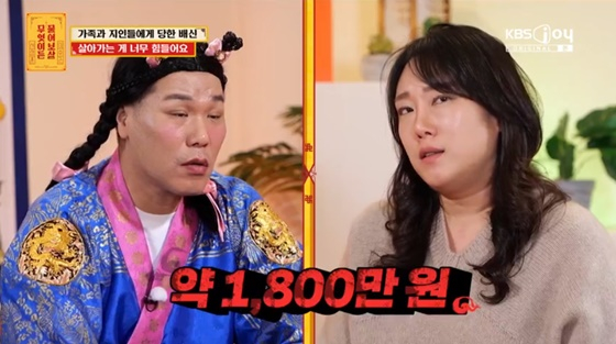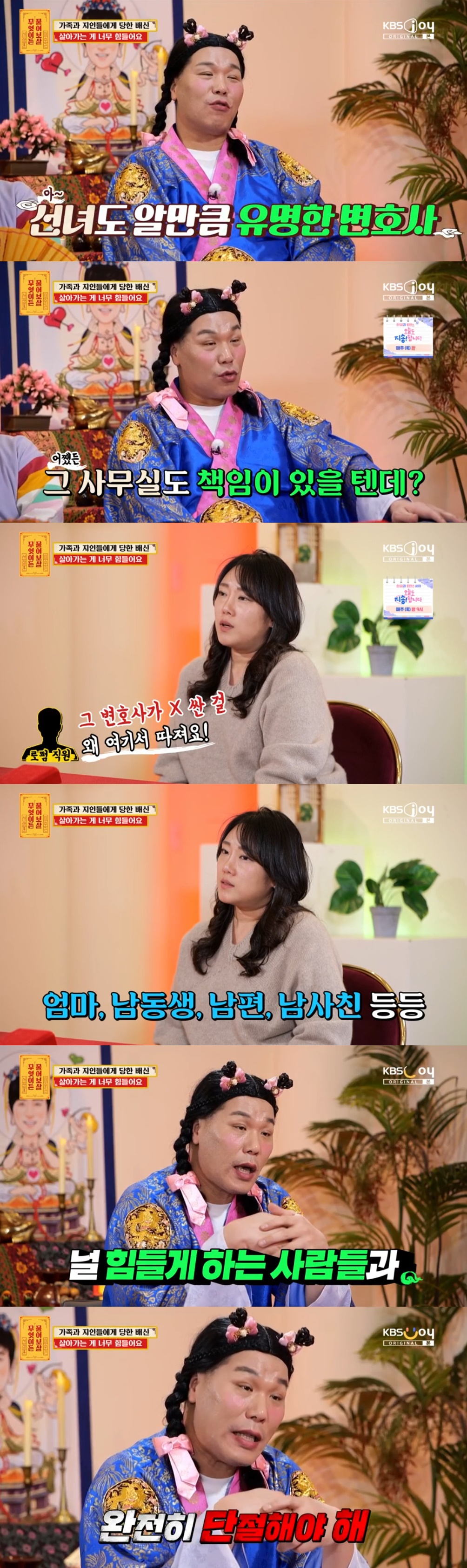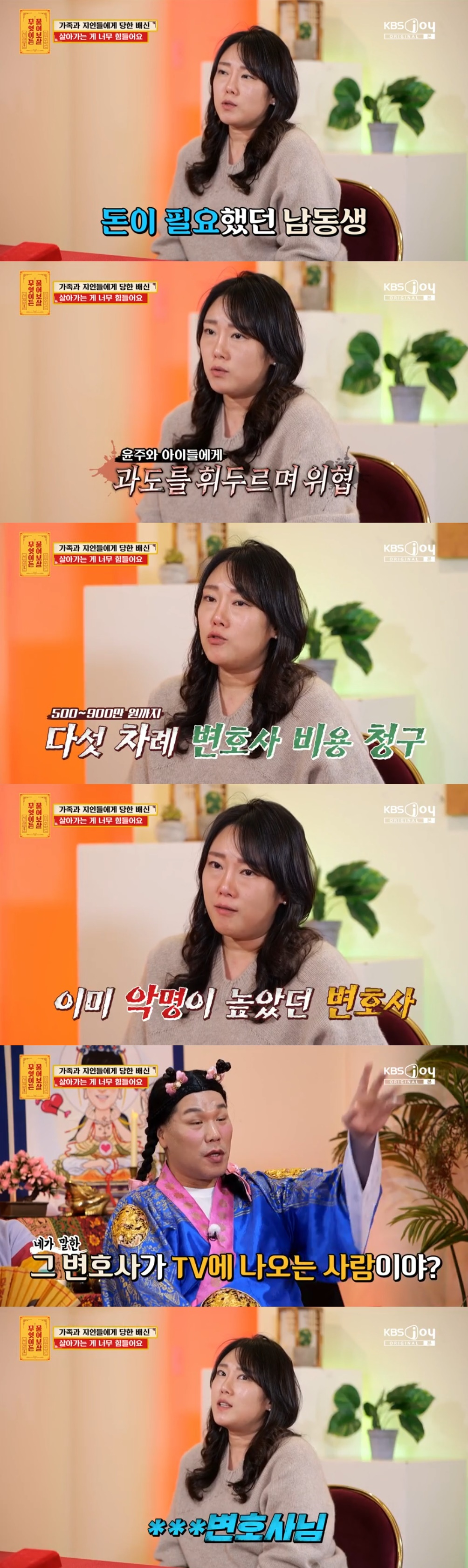 6일 방송된 KBS Joy 예능 프로그램 '무엇이든 물어보살'에는 가족과 남편, 친구와 변호사에게 배신을 당해 살아가기 힘들다는 사연자가 출연했다.