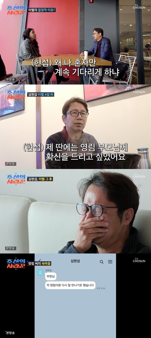이후 심현섭은 고모님을 만나 이별 소식을 말했다. 두 사람의 이별의 큰 이유는 사실 심현섭의 행동 때문이었다. 심현섭은 주말에만 겨우 울산에 내려와서 영림을 만났지만, 울산에 있는 지인들과 만나느라 그마저도 영림과 시간을 갖지 않고 술을 마시고 새벽에 들어갔다. 또한 몸이 안 좋아서 활명수를 사달라고 한 영림의 말을 귀담아 듣지 않고 "네가 사먹지 그랬나"라는 식으로 말해 서운하게 하는 등 자신의 잘못 된 행동을 자책하며 후회했다.