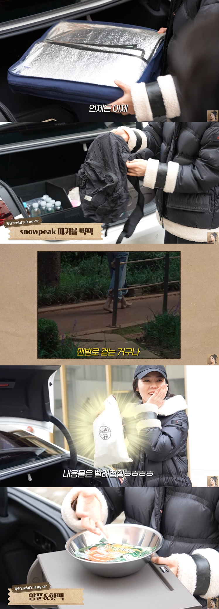 이어 한가인은 자신의 차 용품을 소개했다. 그의 차에는 돗자리, 햇빛 가리개, 맨발 걷기 키트, 극세사 타올, 아이 필통, 유아용 변기 등이 있었다.