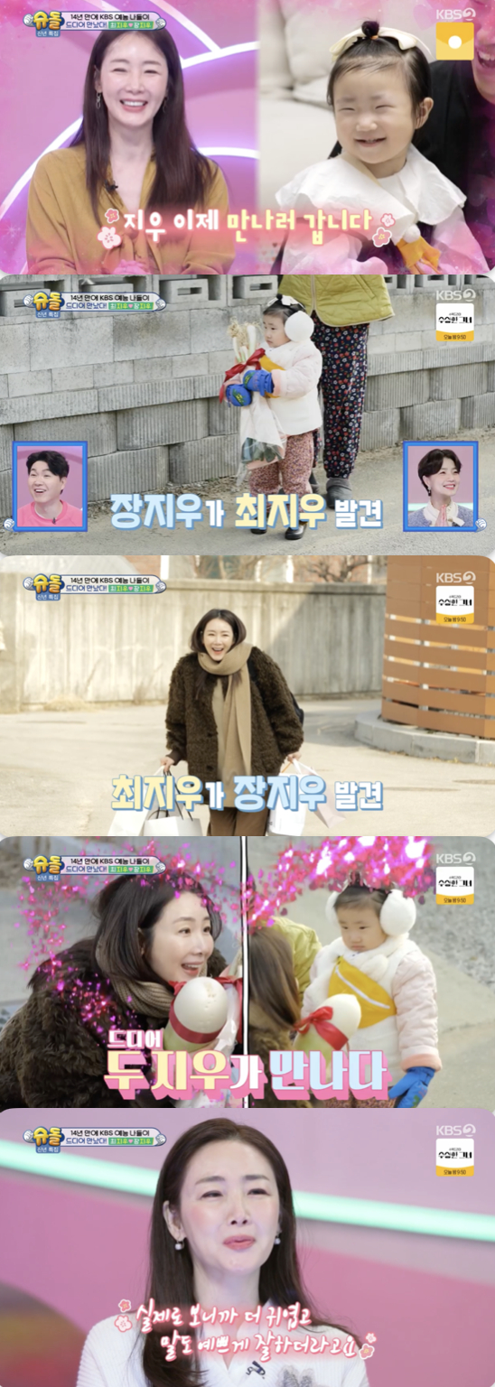 8일 방송된 KBS 2TV '슈퍼맨이 돌아왔다'(이하 '슈돌') 556회는 '우리의 만남은 기쁨이 두 배가 되지우' 편으로 꾸며진 가운데 '슈돌' 안방마님 최지우가 장동민의 원주 시골집인 '동민 타운'을 찾아 동명이인 장지우와 첫 만남을 가졌다.