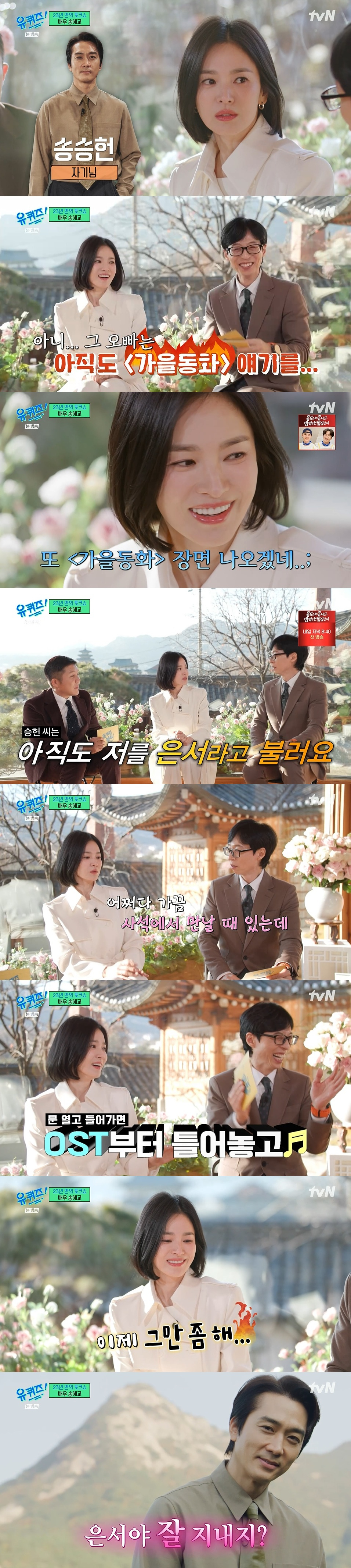 이날 송혜교는 그동안 친한 사람들이 출연했던 '유퀴즈'를 본 적 있는지 묻자 "나와 '더 글로리' 함께 했던 임지연, 이도현, 정성일, 최근에 송승헌 편도 재밌게 봤다"면서 "그 오빠는 아직도 '가을동화' 얘기를 하더라. 그래서 종종 승헌 오빠가 어디 나온다고 하면 '또 가을동화 장면 나오겠다'라는 생각을 한다"라고 밝혔다.
