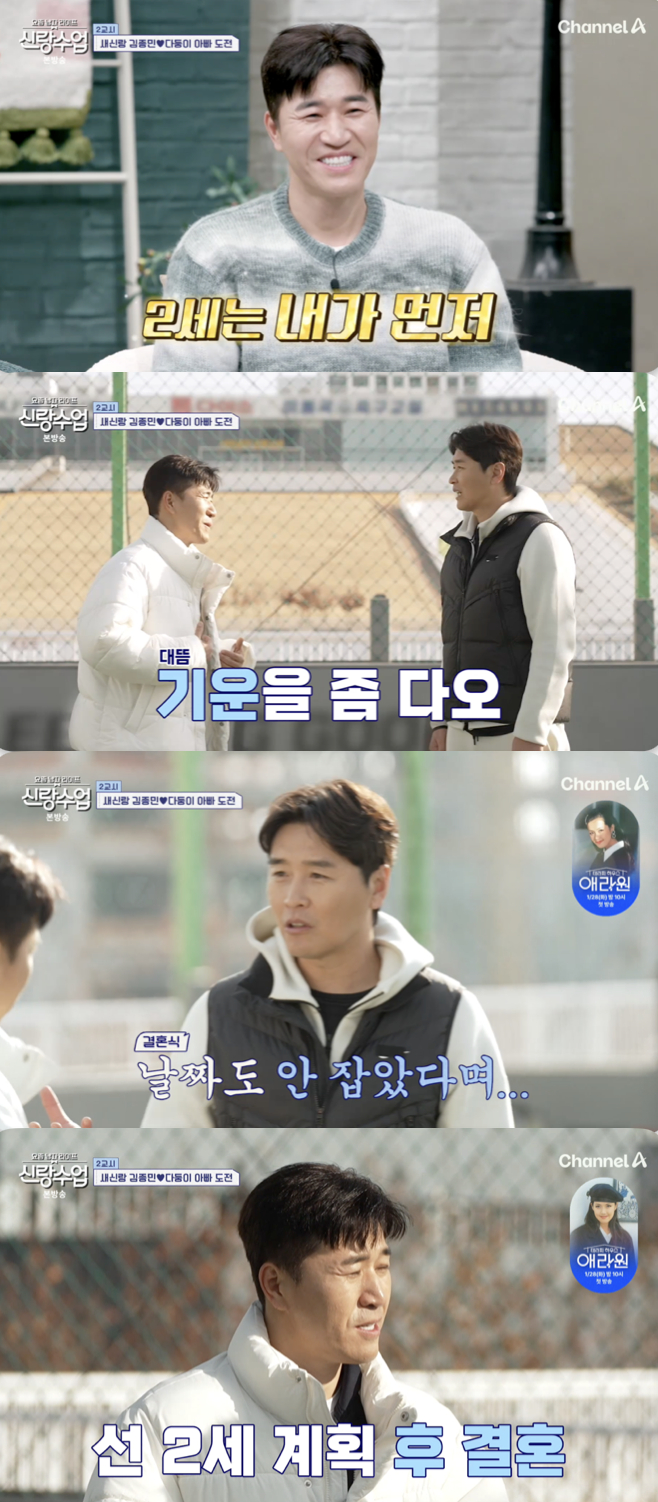 8일 방송된 채널A 예능 프로그램 '요즘 남자 라이프-신랑수업'('신랑수업') 146회에서는 김종민이 동갑내기 절친이자 '오남매' 아빠인 이동국을 찾아가 '2세 계획' 수업을 받는 모습이 펼쳐졌다.