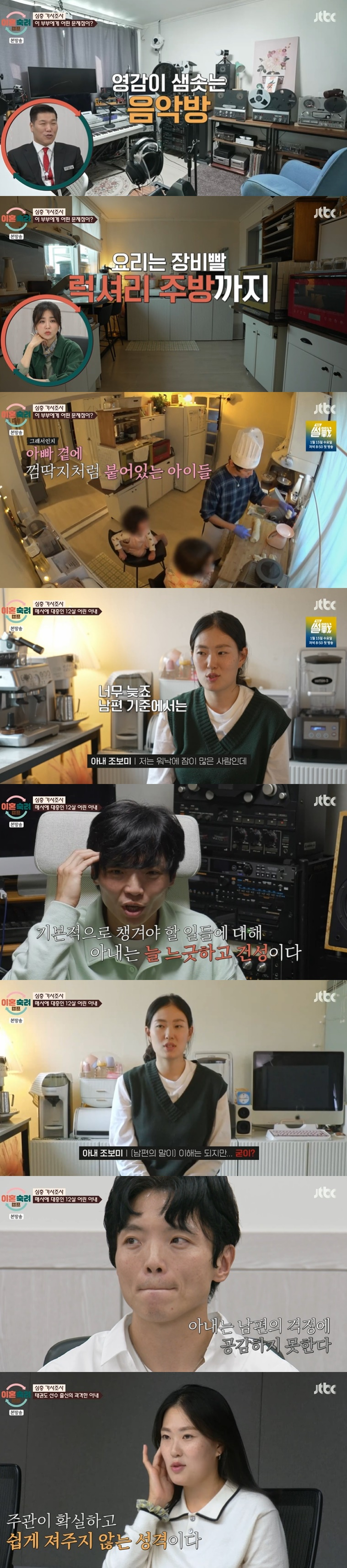 조보미 씨는 남편에게 확고한 육아 철학이 있다며 "남편이 퇴근하고 와서 아기가 울면 징징거리고 우는 소리를 안 들리게 하라고 했다. 쉬어야 하니까. '애들을 다 재우고 네 할 일을 다시 해'라고 했다"고 전했다. 신홍철 씨는 "아내에게 낮 시간에 쉬면 안 된다고 했다"고 말하며 아내에게 집요하게 잔소리하는 모습을 보였다. 조보미 씨는 "남편은 상사고 나는 명령을 하달받는 사람이었다"라고 호소했다.