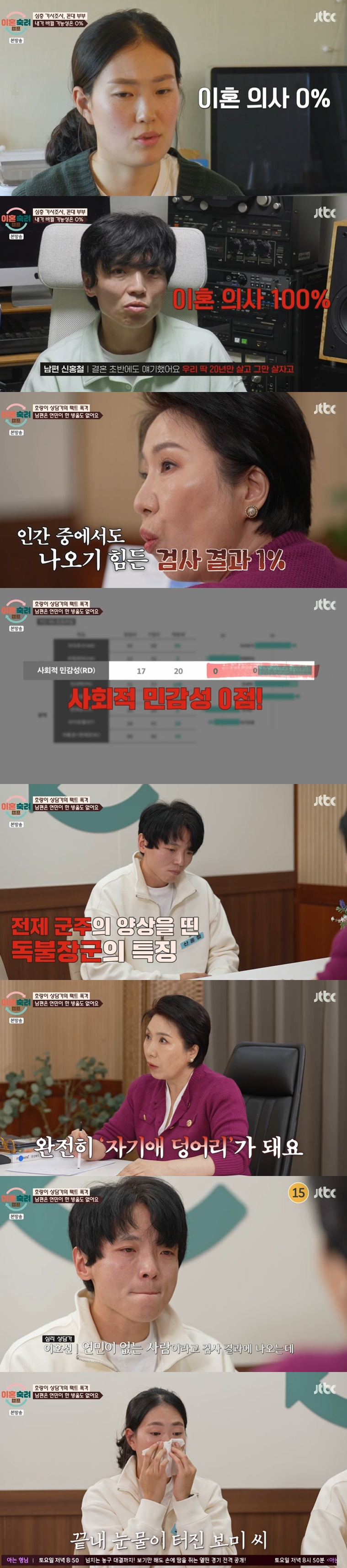 심리 상담 전문가는 사전 검사를 한 신홍철 씨에 대해 "검사 결과는 1%다. 인간 중에서도 나오기 힘든 1%다. 가정을 이 정도로 유지하는 것도 대단한 거다"라며 검사 결과를 보여주며 "타인에 대한 공감 능력이 낮고 연대감이 없다. 독불장군처럼 전제 군주의 양상이 보인다. 이게 까딱하면 '자기애 덩어리'가 된다. 주변 사람들은 타 죽겠구나란 생각이 들었다"고 말했다.