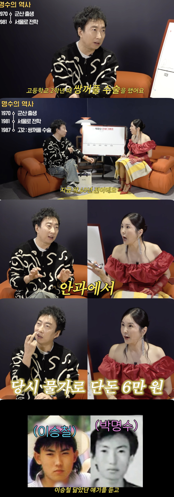 그는 "당시에는 미용이라는 의미의 시술이 없었다. 안과에서 다래끼 수술한다는 걸로 해서 의료 보험을 끼고 선생님이 도와주셨다"라며 "차마 얘 면상을 보니 돈을 더 받고 하기가 미안하다며 그때 당시 6만 원으로 해줬다"라고 정확한 시술 금액까지 공개했다.