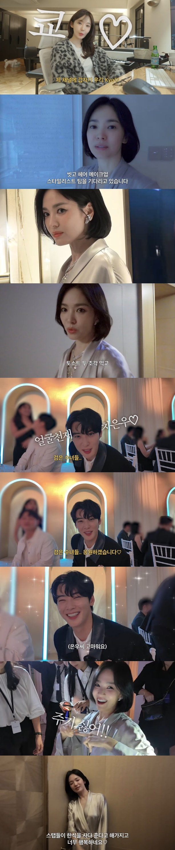 송혜교의 브이로그 영상에는 먼저 송혜교가 해외에서 쥬얼리 행사에 참여한 모습이 담겨 있었다. 송혜교는 완벽한 민낯으로 나타나 "오늘은 주얼리 행사 당일이다. 씻고 헤어 메이크업 스태프들을 기다리고 있다"라고 말했다. 이어 화려한 차림으로 행사장에 등장한 송혜교는 해외팬들과 만나 반가워하는 모습이었다.