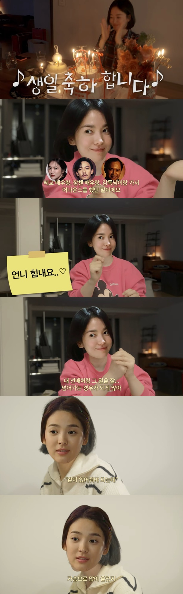송혜교 소속사 대표는 과거 송혜교에게 감동받은 일이 있었다며 "옛날에 혜교 씨가 오우삼 감독님이랑 영화를 찍기로 했고 칸느 기간에 혜교 배우랑, 장체 배우랑, 감독님이랑 가서 어나운스를 했다. 그런데 원작을 가지고 영화랑 드라마랑 문제가 생겨서 감독님이 영화를 포기한 적이 있다. 이걸 어떻게 해야할지 모르겠고 미안하고 괴로웠는데 혜교에게 얘기했더니 (송혜교가) 알겠다고 하고 말았다. 그날 저녁때 혜교가 언니를 오라고 그러더라. 들어갔더니 현관에 샴페인이 있고 포스트잇에 '언니 힘내요'라고 써있더라. 그때 혜교가 20대였다. 일을 하다 보면 문제가 많이 발생하지 않냐. 그런데 (송혜교가) 내 선배처럼 그 일을 잘 넘어가는 경우가 되게 많다"고 전했다.