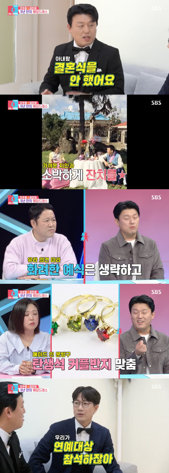 이날 이들은 드레스 숍에서 모습을 드러냈다. 결혼 9년 차 김민재는 "우리는 결혼식을 안 했다. 아내가 화려한 예식을 원하지 않아서 감사한 분들을 모아서 막걸리와 전을 대접했다. 예물 교환도 하지 않았다. 대신 문방구에서 탄생석 커플 반지를 맞췄다"고 밝혔다.