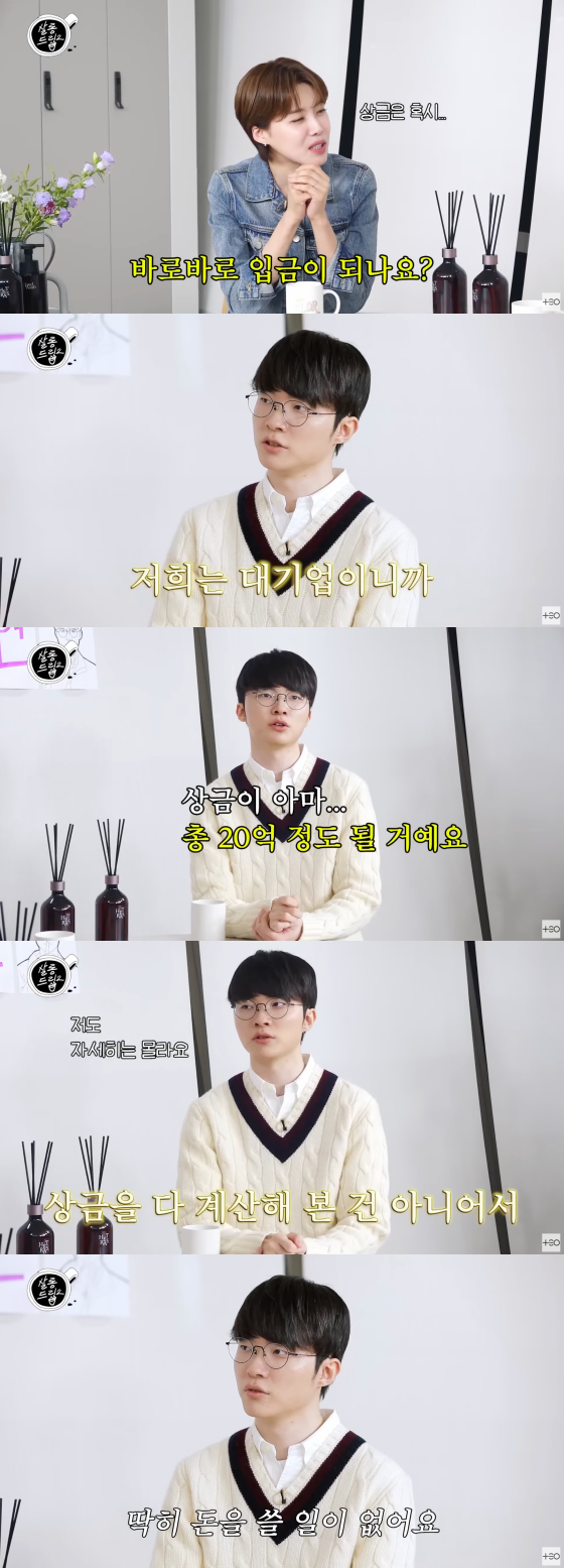 페이커는 "맞다. 우리는 대기업이니까 바로 들어온다. 상금이 아마 총 20억 정도 되지 않을까 싶다. 다 계산한 건 아니라서 정확히는 모른다"고 덤덤하게 밝혔다.