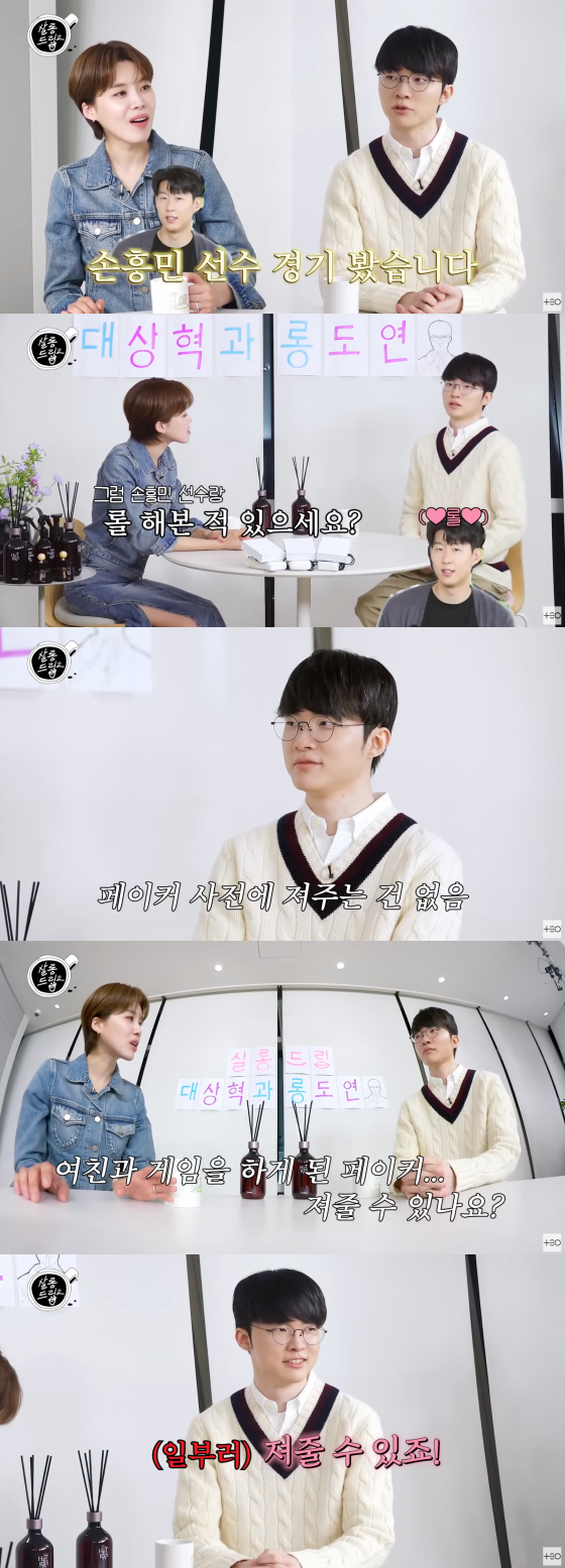 이에 장도연이 "손흥민 선수가 롤에 진심이던데 함께 게임을 해 본 적은 있냐"며 "손흥민 선수에 대한 존경을 담아 져줄 의향도 있냐"고 묻자 페이커는 "함께 게임을 해 본 적은 없고, 져줄 수도 없다"고 단호히 밝혀 웃음을 안겼다.
