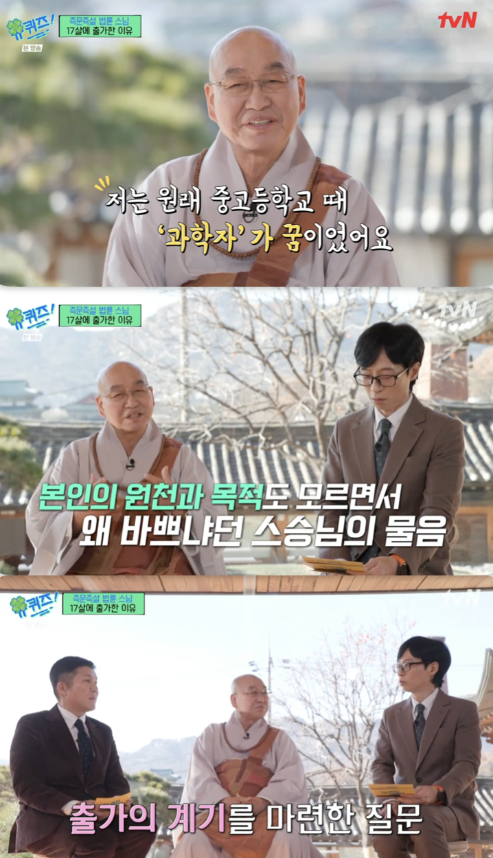 이날 MC 유재석은 법륜 스님에게 출가 결심 계기를 물었다. 이에 스님은 "저는 원래 중고등학교 때 '과학자'가 꿈이었다. 그래서 종교인이 된다는 생각을 한 번도 해본 적 없었다"라고 말문을 열었다.