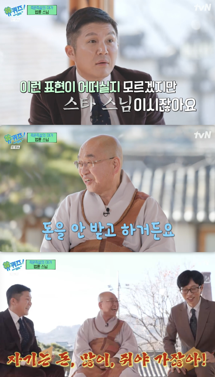 그 가운데 MC 조세호는 스님에게 "이런 표현이 어떨지 모르겠지만 '스타 스님'아니냐"라고 했다. 그러자 스님은 "제가 돈을 안 받고 한다. 그래서 여기저기 많이 오라 하는 것 같다. 돈이 안 들잖지 않냐"라며 해당 수식어를 거부했다.
