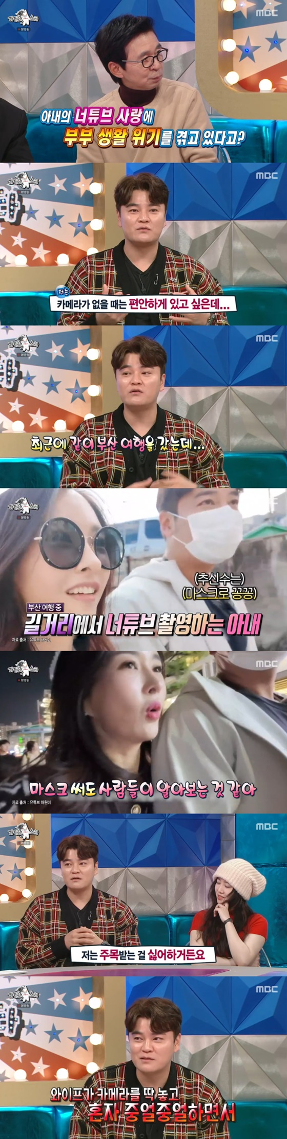 그러면서 "나는 주목받는 걸 싫어한다. 식당에서도 사람들이 쳐다보는 게 불편하다. 그런데 와이프가 (식당에서) 카메라를 놓고 혼자 중얼거린다. '먹어도 되냐'고 물으면 촬영해야 한다고 한다"며 유튜버 아내를 둔 남편으로서 고충을 털어놨다.