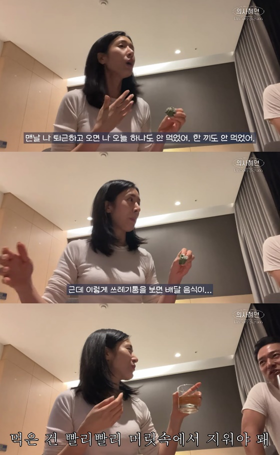 두 사람은 호텔 방에서 룸서비스로 회를 시켰다. 민혜연은 "오빠(주진모)의 다이어트 비결은, 먹고 나서 까먹는 거다. 맨날 나 퇴근하고 오면 '나 오늘 한 끼도 안 먹었다'고 한다. 그런데 쓰레기통 보면 배달 음식(이 있다)"라고 설명했다.
