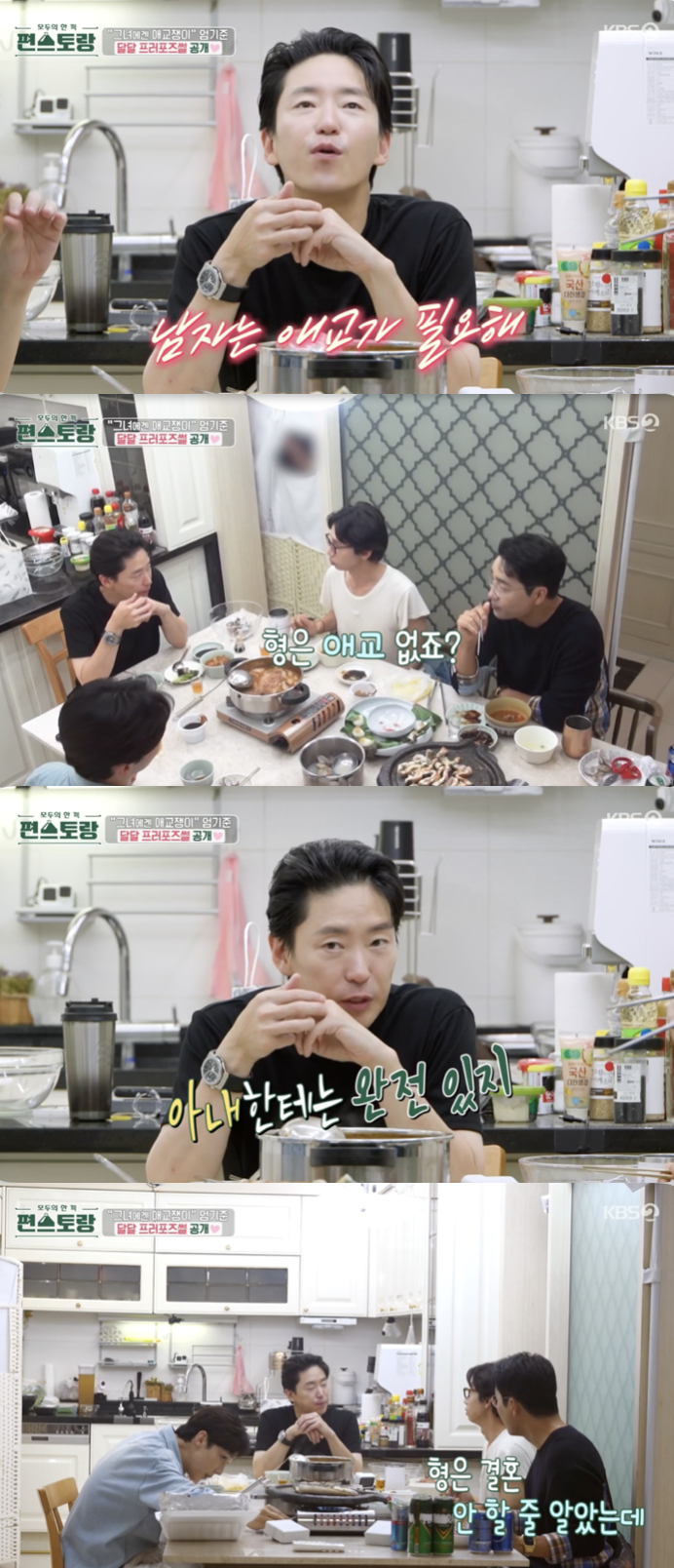 식사 중 윤종훈을 보며 웃던 하도권은 "나는 종훈이가 술 마시고 애교부릴 때가 너무 귀엽다"며 애정을 드러냈다. 그러자 엄기준은 "남자는 애교 있는 게 필요한 것 같다"라고 했고, 이를 들은 봉태규는 엄기준에게 "형은 애교 없죠?"라고 물었다.