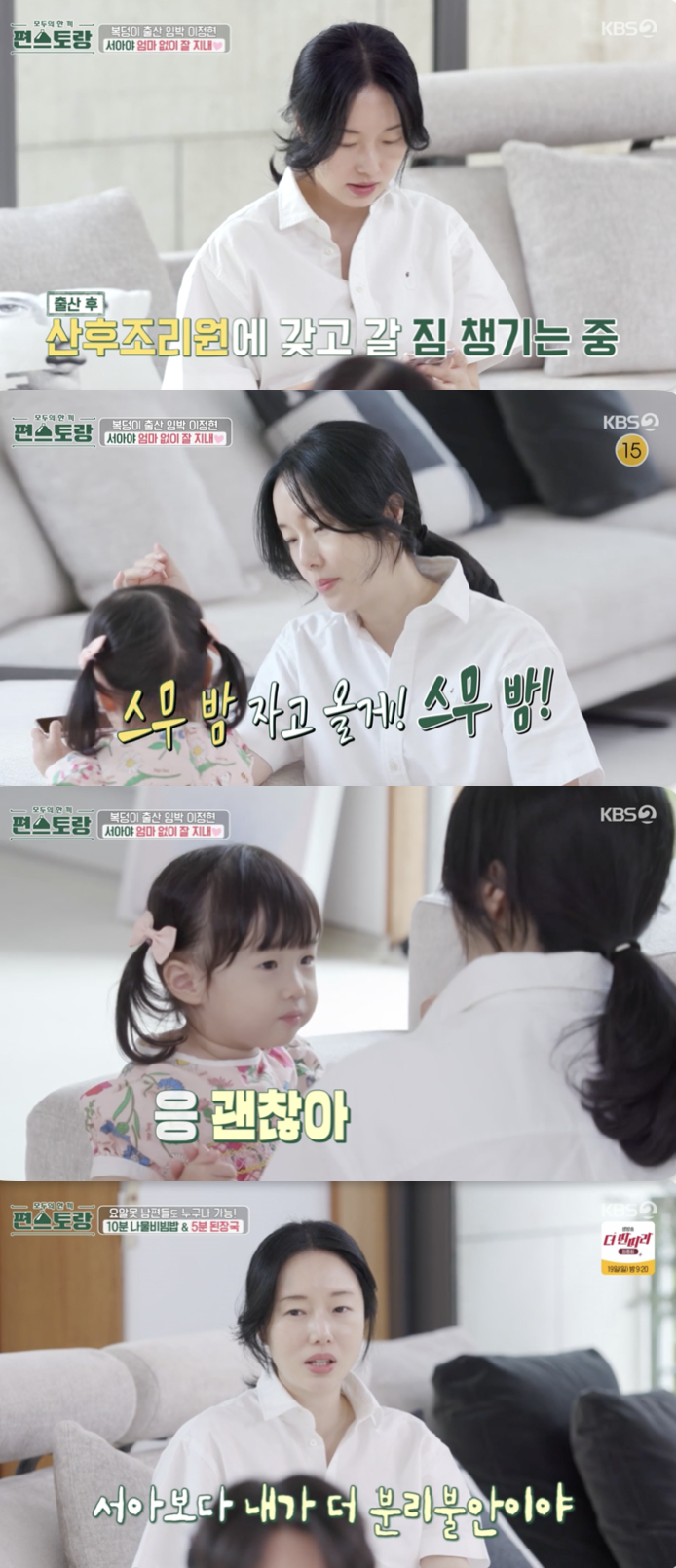 결국 이정현은 남편에게 "18일 동안 잘할 수 있겠냐"라며 "서아보다 내가 더 분리 불안이다. 서아가 너무 보고 싶으니까 퇴근하면 하루에 한 번씩 서아 좀 데리고 와라"라고 부탁하기도.