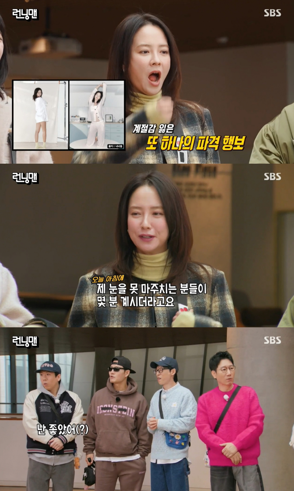 송지효는 "과감하게 속옷이라서 그렇게 찍었는데 오늘 아침에 내 눈을 못 마주치는 분들이 몇 분 있더라"고 말했다. 이에 양세찬은 "난 좋았다. 기지개를 켜고 있는 거 보니까 좋더라. 여러 개 봤다. 다 봤다"라고 말해 웃음을 자아냈다.