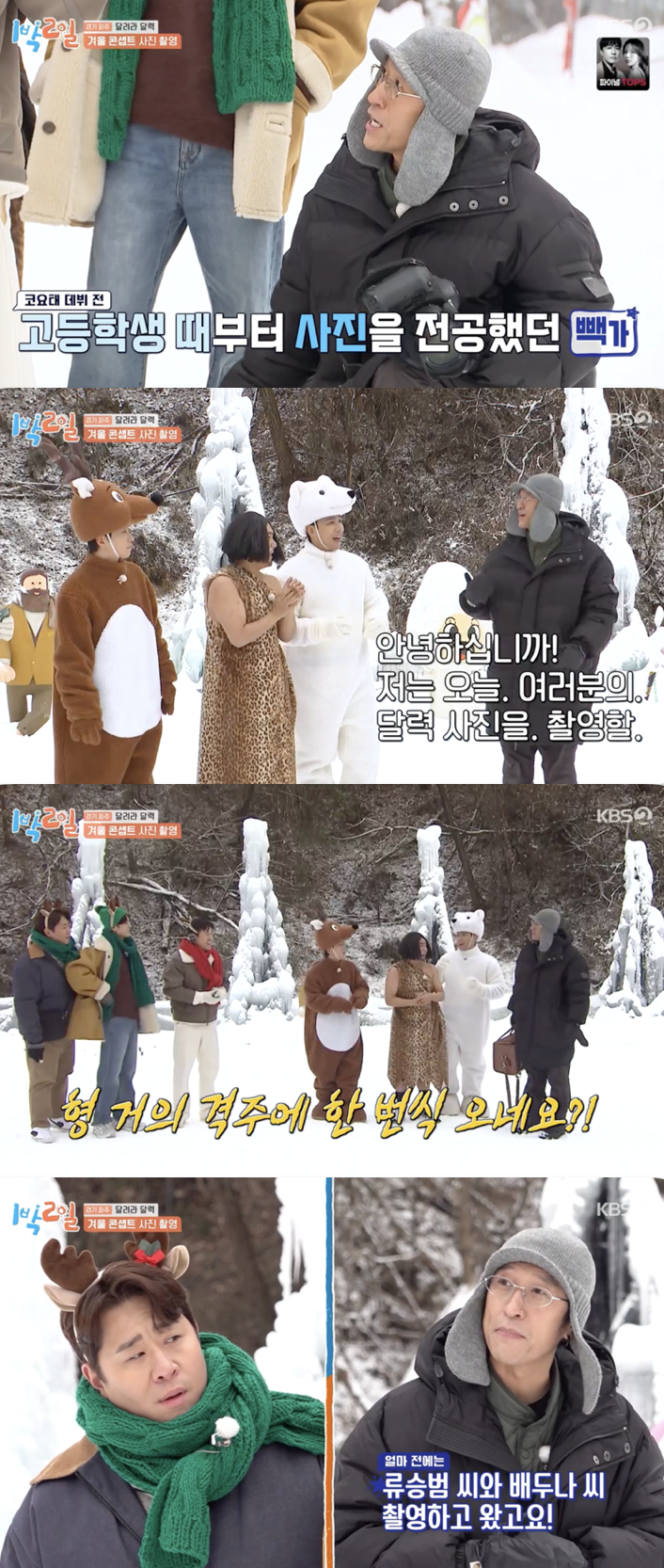 19일 방송된 KBS 2TV '1박 2일 시즌4'(이하 '1박 2일')에서는 그룹 코요태의 빽가가 멤버들의 겨울 콘셉트 달력 사진 촬영을 돕는 모습이 그려졌다.