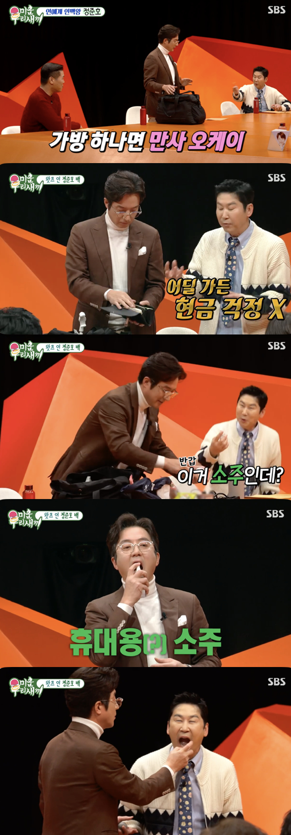 한편 정준호는 미스트 통에 담긴 액체를 꺼내 신동엽에게 건넸다. 냄새를 맡은 신동엽은 "이거 소주인데?"라며 반가워했다. 이어 정준호는 소주를 입에 칙칙 뿌리며 평소 휴대용으로 소주 100mL를 이렇게 지참한다고 자신만의 노하우를 뽐내 모두를 놀라게 했다.