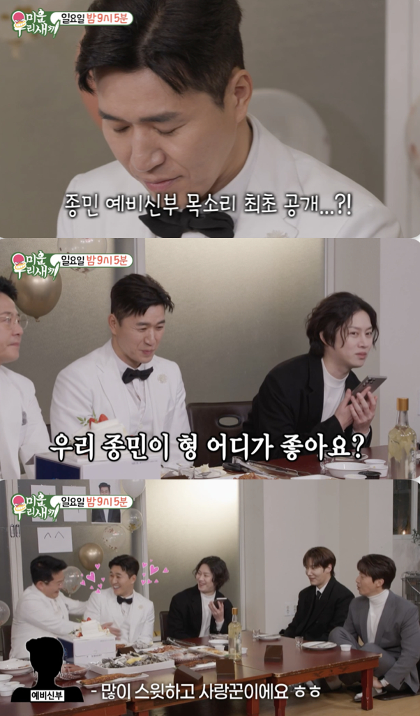 한편 김종민의 11살 연하 예비 신부의 목소리가 최초 등장하기도 했다. 전화를 건네받은 김희철이 예비 신부에게 "(김)종민이 형 어디가 그렇게 좋은지 얘기를 들어봐도 되냐"라고 하자 그는 "오빠가 아주 듬직하고 스윗하고, 사랑꾼이다"라며 애교스러운 목소리로 답해 보는 이들의 설렘을 자아냈다.