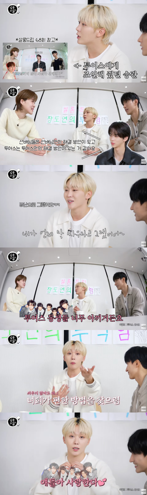 이에 승관은 "저번에 투어스가 '살롱드립 2'에 출연해서 제가 (투어스한테) '멤버들끼리 많이 싸워야 친해진다'고 말했다는 것에 대해 얘기하고 싶다"고 답했다.
