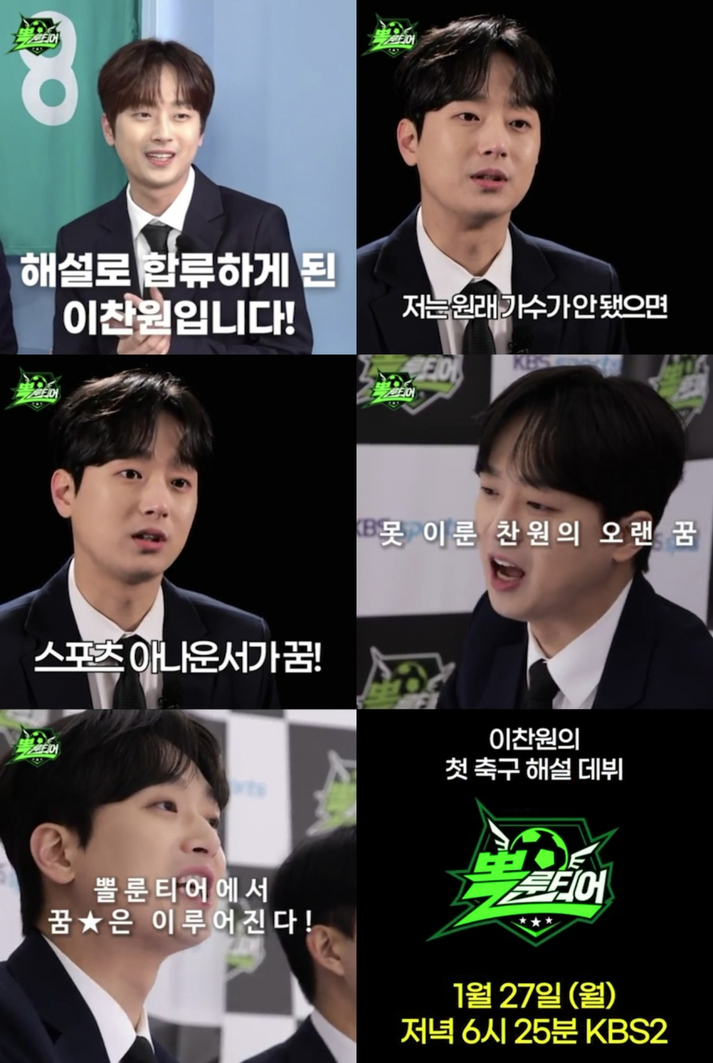 23일 KBS 설특집 '뽈룬티어'에 따르면 이찬원은 오는 27일과 28일 양일간 방송되는 '뽈룬티어'에서 축구 해설가 데뷔를 앞두고 있다.