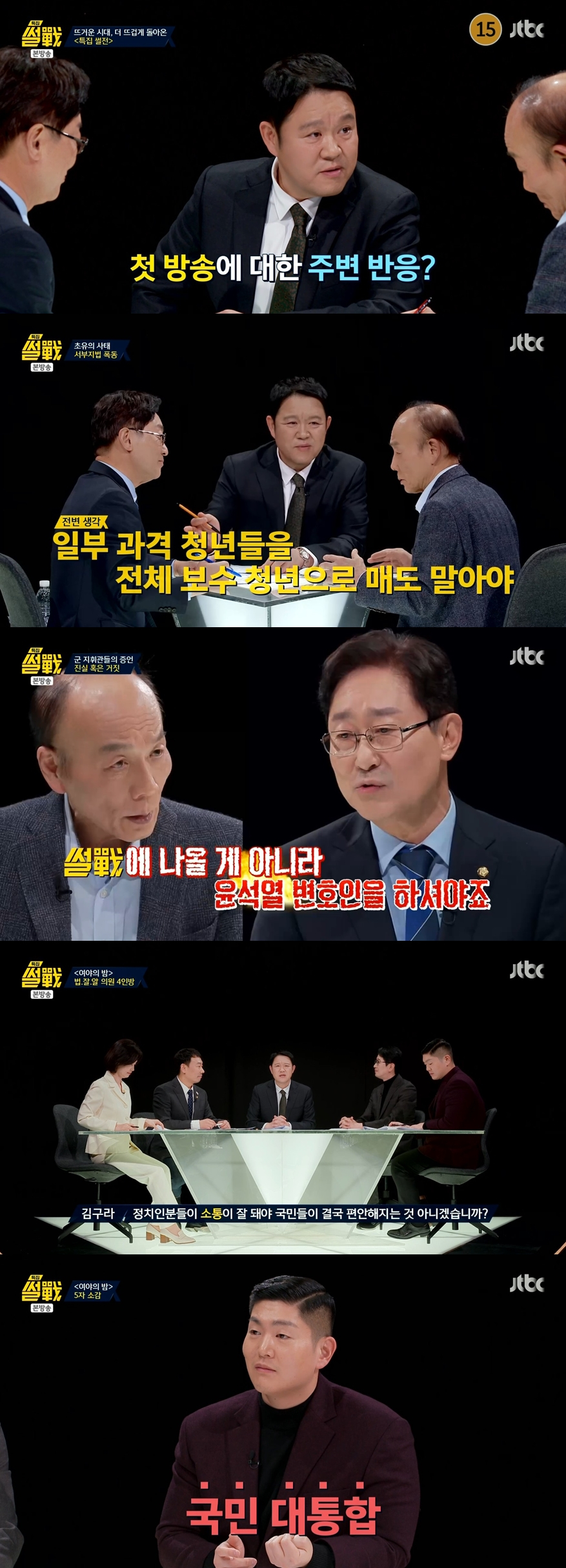22일 방송된 JTBC '특집 썰전' 2회에서는 MC 김구라의 진행 아래 전원책 변호사와 더불어민주당 박범계 의원이 논객으로 등장해 불꽃 튀는 논쟁을 벌였다. 더불어민주당 김용민 의원, 국민의힘 주진우 의원, 김재섭 의원, 조국혁신당 박은정 의원은 '여야의 밤' 코너를 통해 현 시국과 관련한 치열한 토론을 펼쳤다.