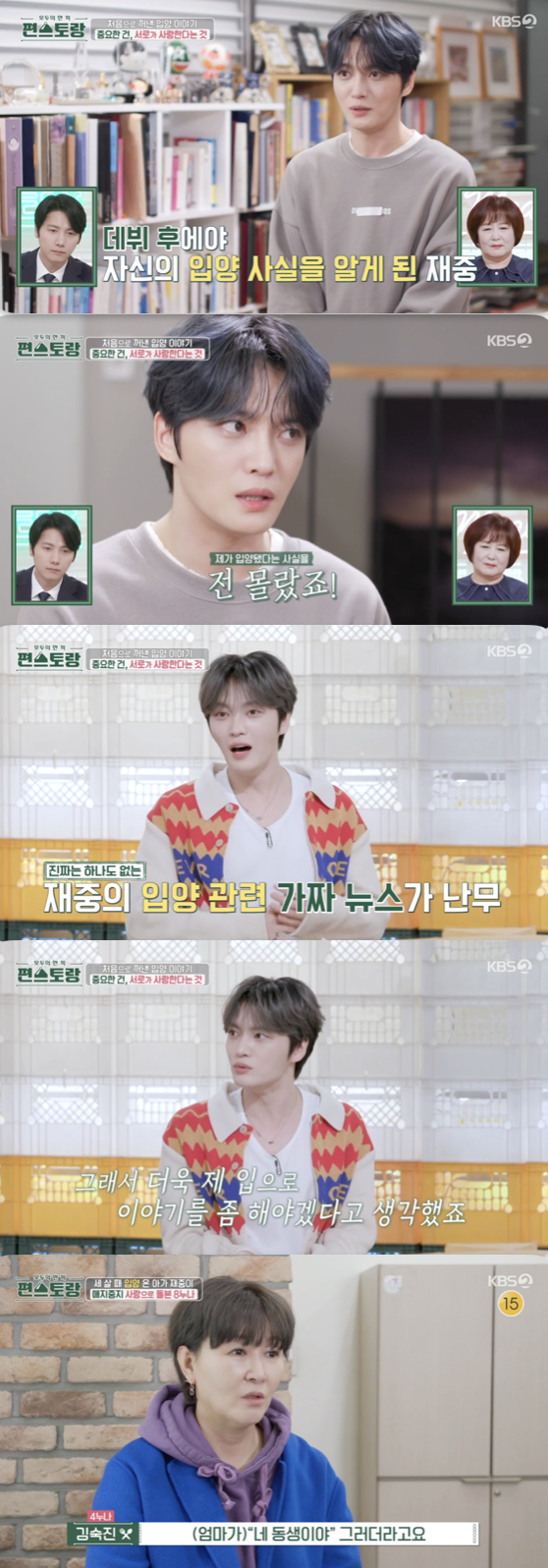 이를 스튜디오에서 지켜보고 있던 김재중은 "나랑 가족들은 조용히 하고 있는데 주변에서 마음대로 소문을 퍼뜨렸다"라며 "(인터넷에 있는 제 입양과 관련된 이야기는) 진짜는 하나도 없이 전부 가짜다. 악성 댓글도 많이 생성되다 보니까 더 제 입으로 내 이야기를 해야겠다고 생각했다"라며 입양 이야기를 직접 꺼내기로 결심한 이유를 밝혔다.