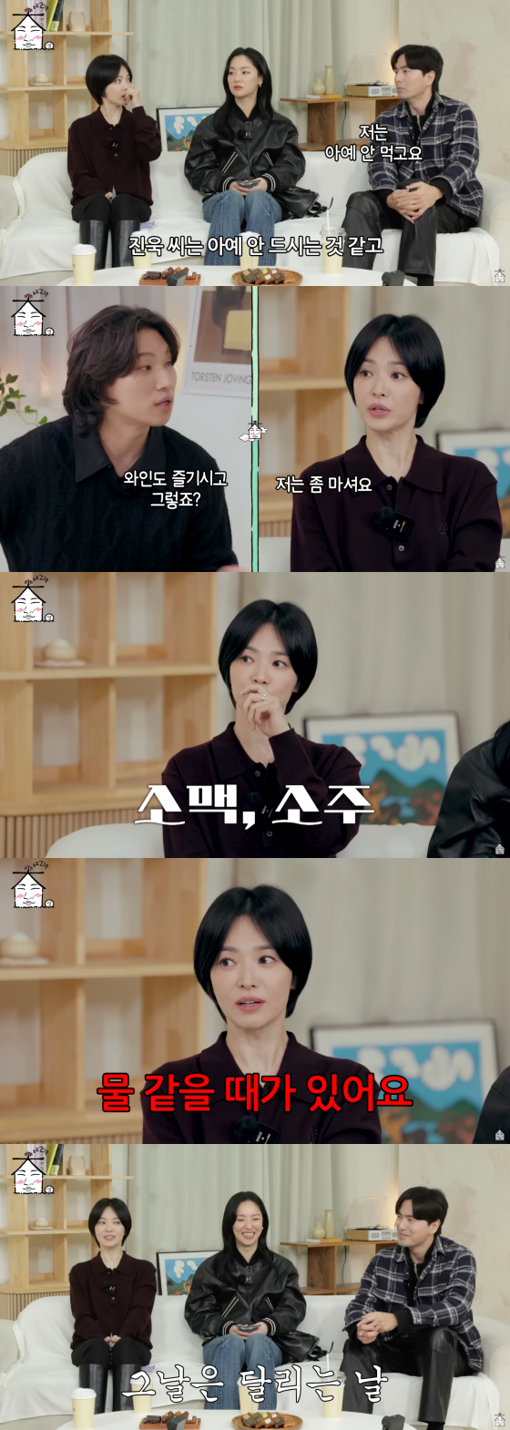 송혜교는 주종에 대해서도 언급했다. 대성이 "술을 다 안 드시냐"고 묻자 송혜교는 "이진욱은 아예 안 먹고 전여빈은 조금, 저는 즐긴다"고 답했다.