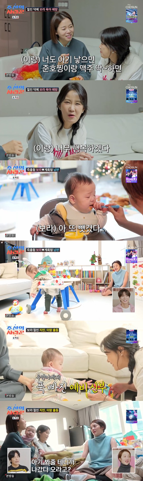 27일 오후 방송된 TV조선 '조선의 사랑꾼'에서는 황보라의 육아가 공개됐다. 이날 황보라는 이른 아침부터 일어나 '육아 계획형'남편 차현우의 방식대로 계획적인 육아를 이어갔다. 아기의 첫 수유부터 낮잠, 이유식 먹기이까지 황보라는 정해진 계획표를 따라 아들 우인이를 돌봤다. 특히 우인이는 잠이올 때 방에 들어가서 눕히면 스스로 자는 모습으로 놀라움을 자아냈다.