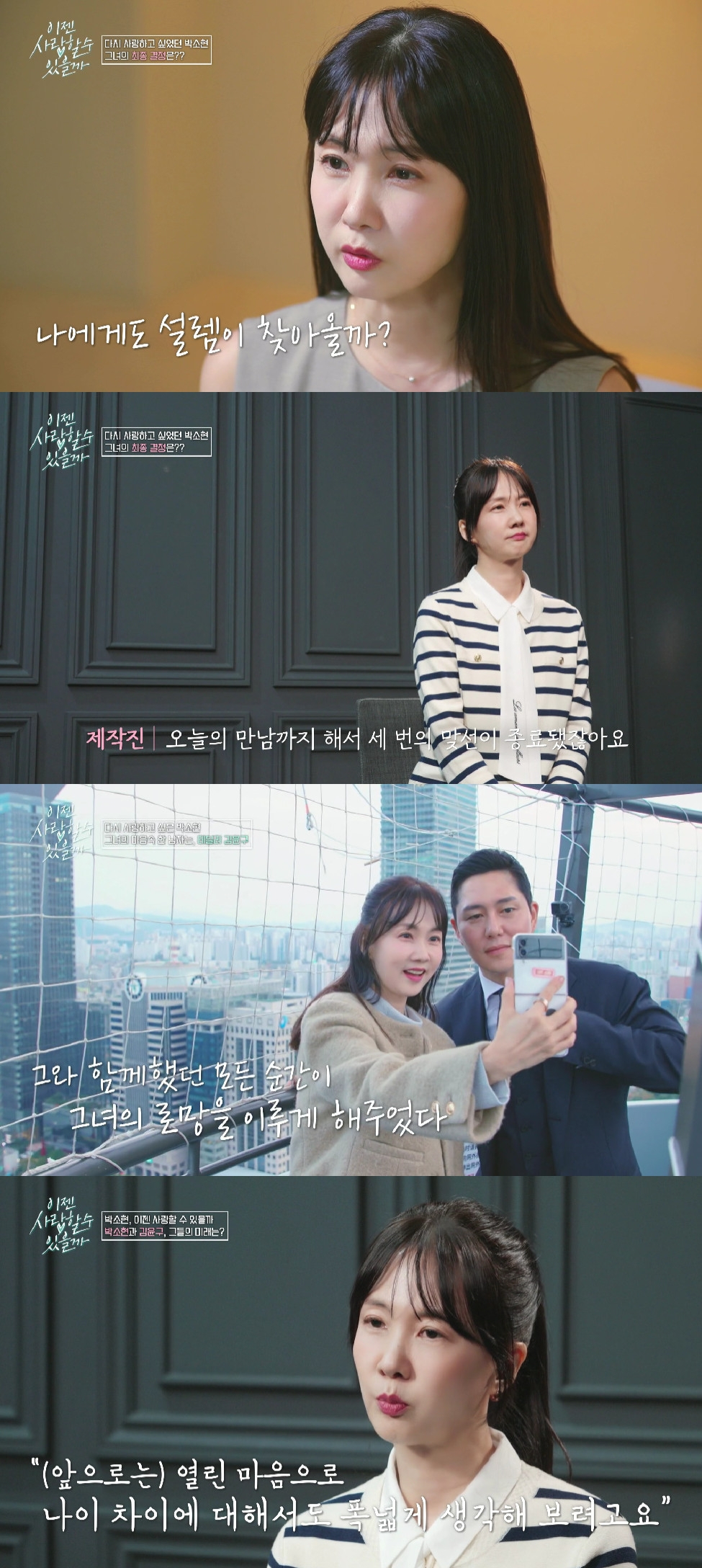 그는 "연애를 오래 쉬었던 사람이 저 자신에 대해서도 잘 모르고, 정의하기 어렵기 때문에 앞으로는 열린 마음으로 나이 차이에 대해서도 폭넓게 생각해 보려고 한다. 주변인들과도 많은 얘기를 나눴고, 저도 이 틀을 깨고 한 발짝 나아가보자는 생각이다. 이 프로그램을 하면서 저에 대해서 알게 됐다"고 말했다.