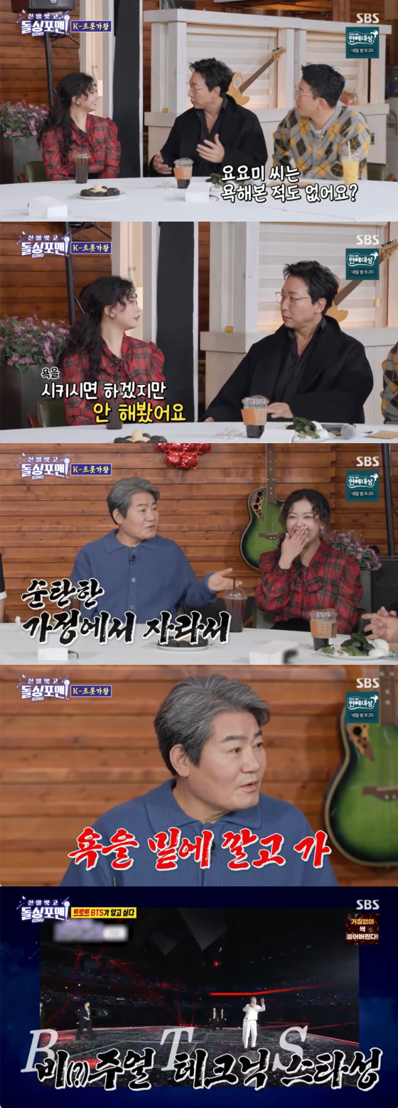 옆에서 이를 들은 진성은 "(요요미가) 순탄한 가정에서 자라서 그런 것"이라며 "우리 같은 사람들은 외모에서 풍기는 분위기가 있지 않냐. 욕을 밑에 깔고 간다. 기본으로 깔고 가는 거다"고 너스레를 떨었다.