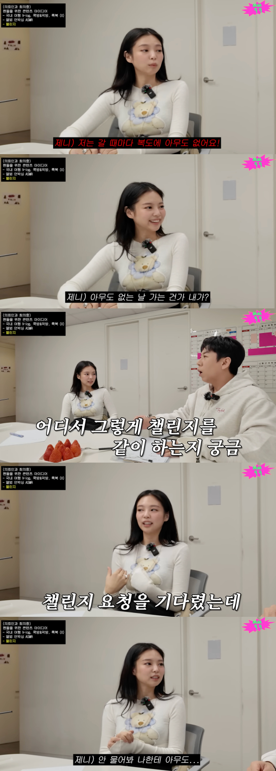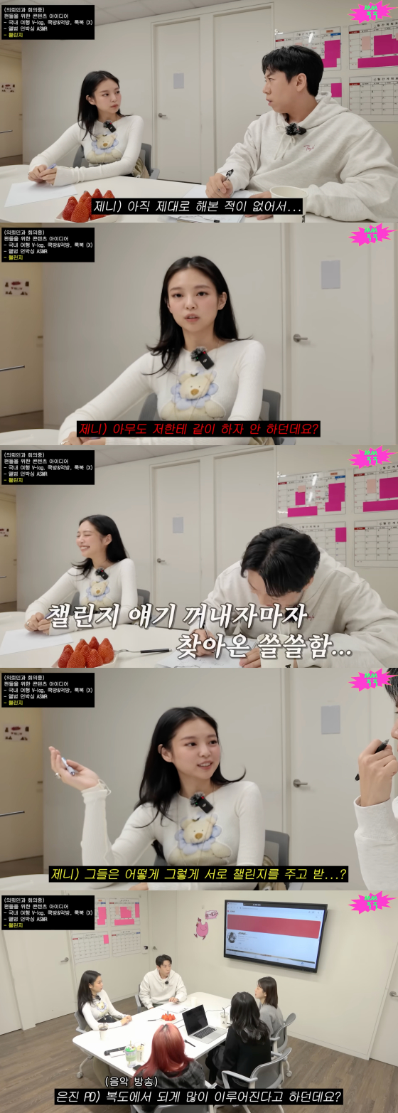 '쑥쑥' 제작진은 제니의 신곡 홍보 방안 중 하나로 챌린지를 떠올렸다. 하지만 제니는 "제가 아직 (챌린지를) 제대로 해본 적이 없다"며 "아무도 저한테 같이 하자고 안 하더라"고 서운함을 토로했다.