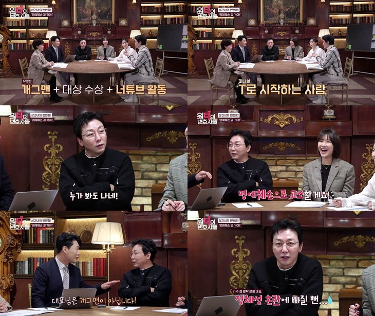 탁재훈이 "누가 봐도 나 아니냐"며 "명예훼손으로 고소하겠다"고 너스레를 떨자, 신규진은 탁재훈에게 "잊으시면 안된다. 대표님(탁재훈)은 개그맨이 아니다"고 받아 쳤다. 이지혜와 3인의 변호사들 역시 "맞다", "가수이지 않냐"며 정체성 혼란에 빠질 뻔한 탁재훈에게 그의 정체성을 상기시켰다. 이에 탁재훈은 "아, 틀린 게 몇 개 있긴 하네"라고 머쓱한 듯 웃으며 답했다. 오는 2월 3일 오후 8시 40분 방송.